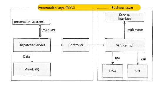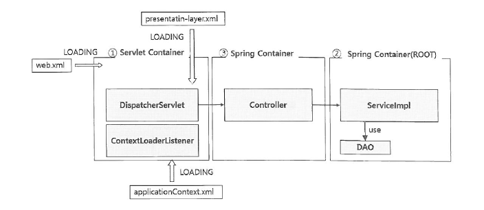 web.xml에서 명령에 따라 DispatcherServlet이 생성되어 presentation-layer.xml 파일을 읽고 스프링컨테이너를 구동하면 Controller객체들이 생기며 프레젠테이션 영역 활용 가능, 이 때 applicationContext.xml 파일을 읽어 비즈니스 컴포넌트 생성하기 위해 ContextLoaderLisner 클래스 사용